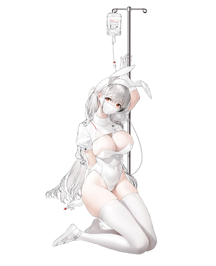 Catheter extending from the drip stand to Ruby's right hand, a mask covering her mouth, and a cast-off bunny suit— a bona fide nurse figure indeed.