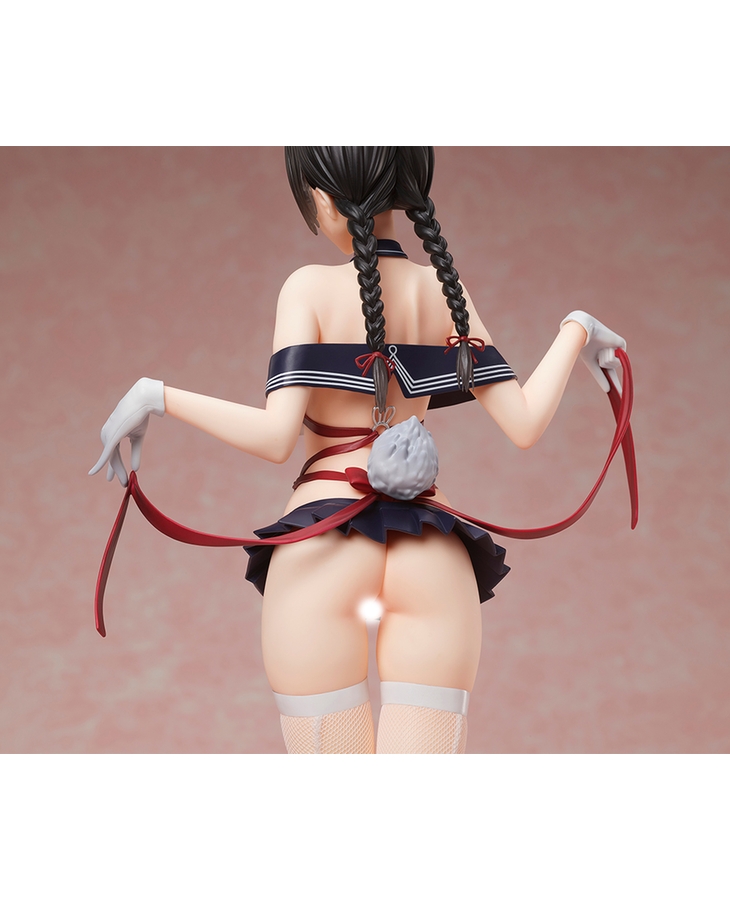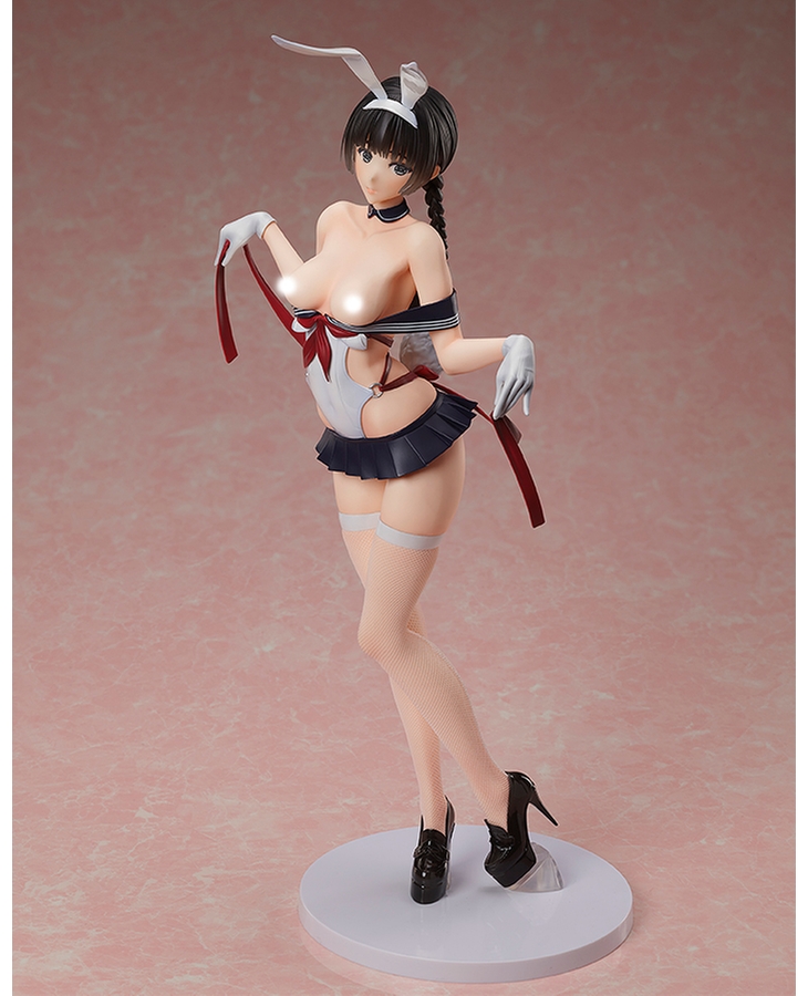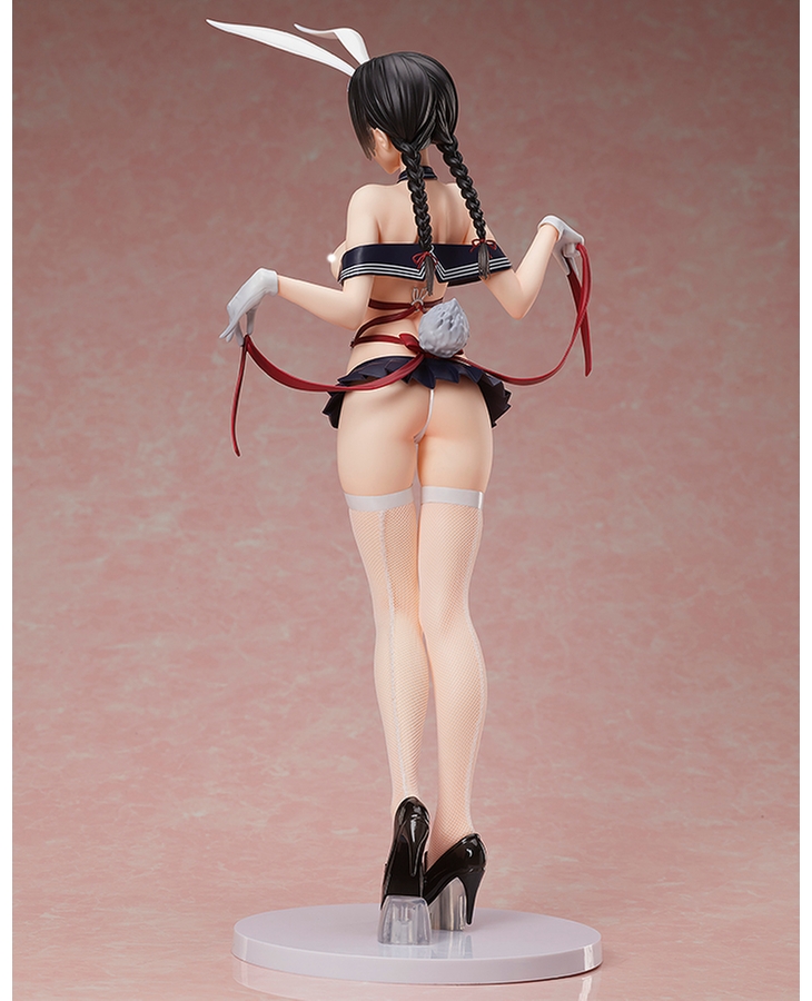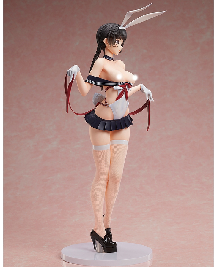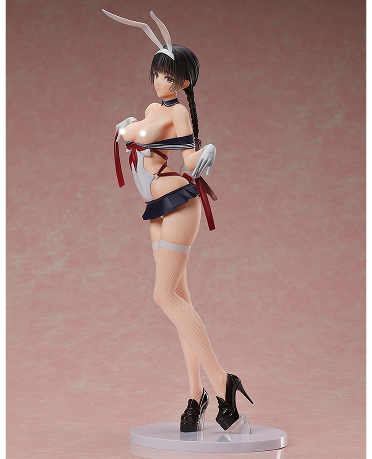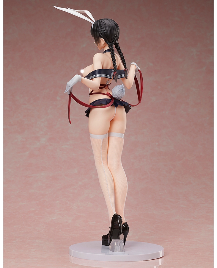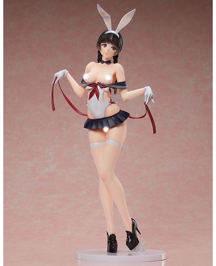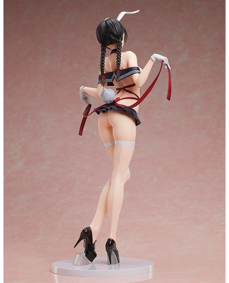 Her outfit is an amalgamation of a bunny suit and a school uniform that accentuates her gorgeous body line, and her despondent pose as she holds out the ribbons creates an air of elegance from every angle.